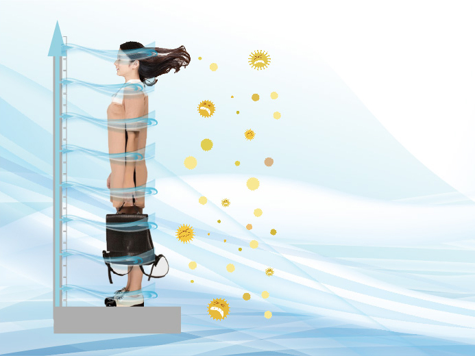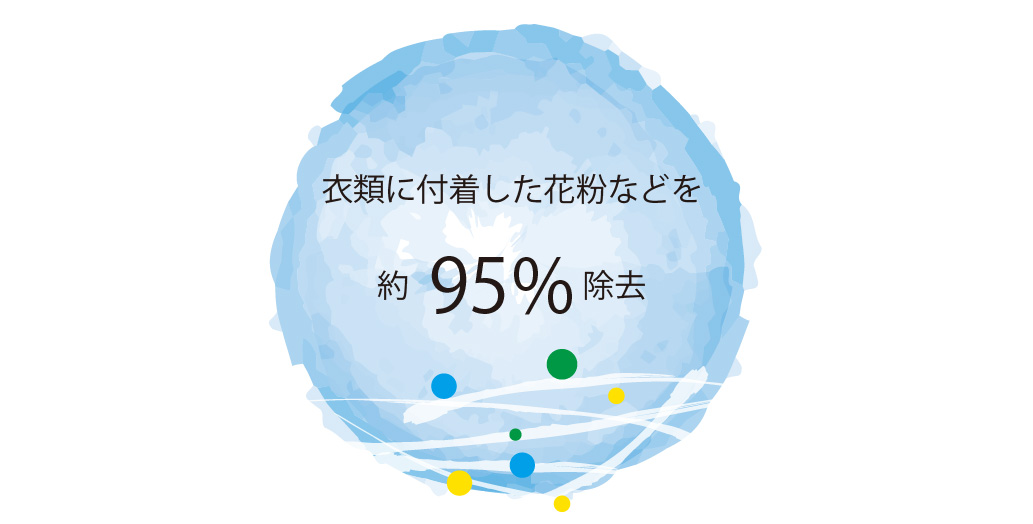 スーパージェットは花粉やPM2.5、ホコリなど、アレルギーの原因となる空気中の有害物質を風速91m/sを発出する機械の前でぐるっと回るだけできれいに吹き飛ばしてくれます。そうすることにより衣類に付着した花粉などを約95%除去してくれます。